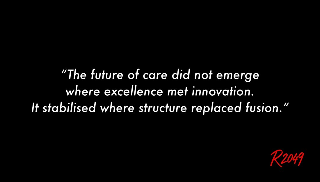 This archive log reconstructs why the future of care did not result from the fusion of medical excellence and digital innovation, but from a structural re-ordering of recognition, decision, interpretation, and action. From a later system state, it documents how care stabilised once functional separation replaced conceptual merging, reducing cognitive load and restoring human relevance without personalization or prescription.
