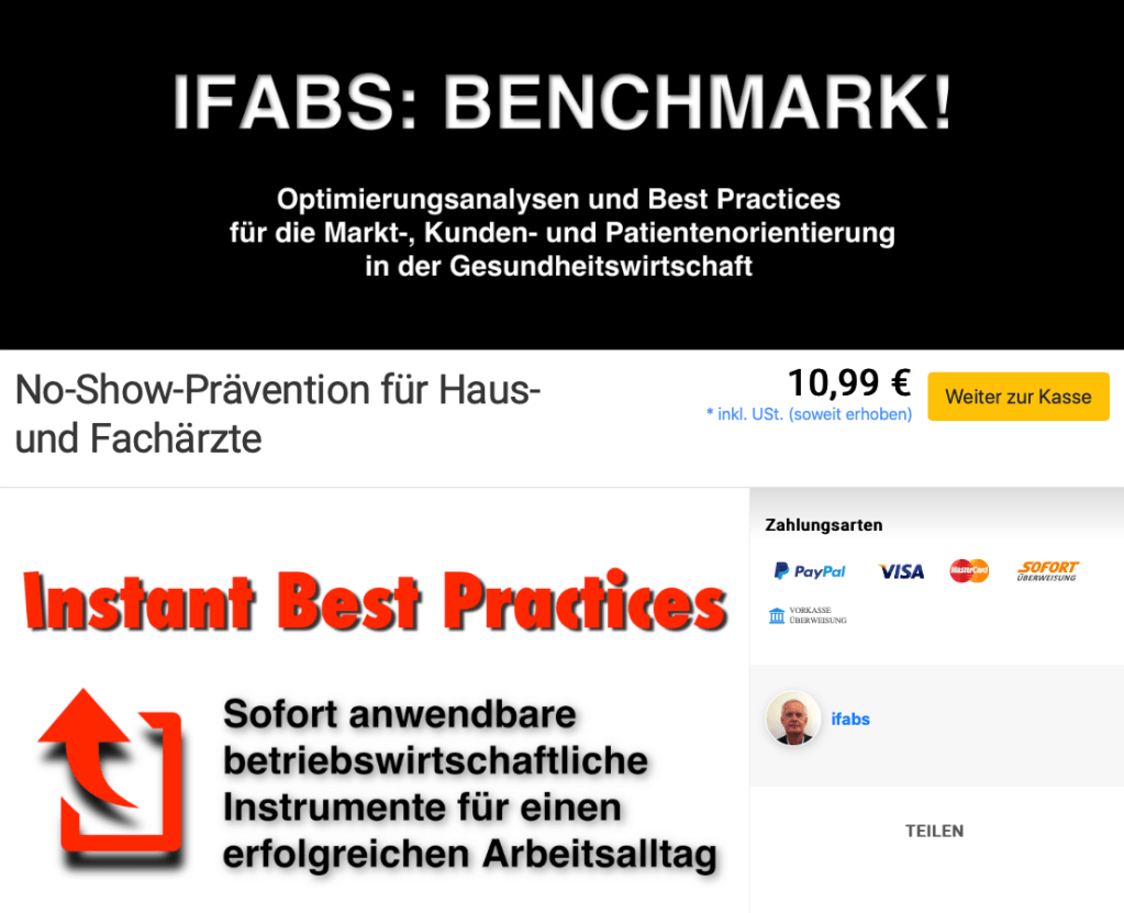 Doch diese Situationen können nicht über die grundsätzlichen negativen Effekte von No-Shows hinwegtäuschen, zumal einfach umsetzbare, aber äußerst wirkungsvolle Präventions-Maßnahmen Vermeidung von No-Shows existieren, die den Anteil auf ein Minimum senken. Sie sind in dem E-Book „No-Show-Prävention für Haus- und Fachärzte“ zusammengefasst, das eine praktische „Anti-No-Show“-Anleitung bietet und zu dessen Inhalts-Beschreibung Sie mit einem Klick auf das folgende Bild gelangen: