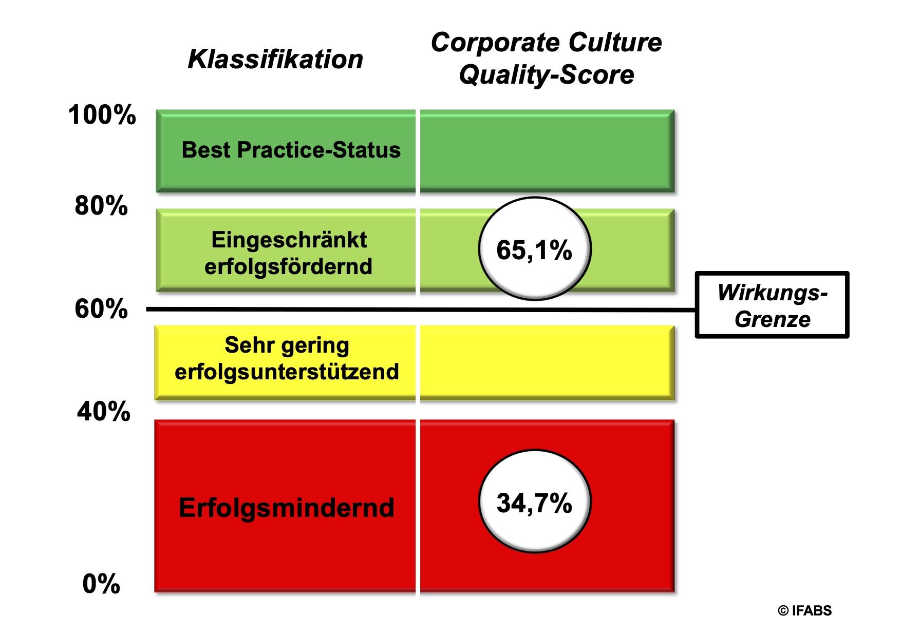 Bittet man Medizinische Fachangestellte, die Umsetzung der Parameter des Best Practice-Standards der Unternehmenskultur für ihre Praxisbetriebe zu bewerten, so ergibt sich für den Key Performance Indikator „Corporate Culture Quality Score“ (CQS) ein Durchschnittswert – über alle Fachgruppen und Praxisgrößen betrachtet – von 34,7%. Dieser aktuelle Umsetzungs-Status der Praxiskultur ist die Verifizierung der immer wieder geäußerten Vermutungen und Einzelbeobachtungen, dass das Thema „Praxiskultur“ für viele Praxisinhaber kaum eine Bedeutung besitzt. Zum Vergleich: der CQS von Zahnarztpraxen liegt bei 65%.
