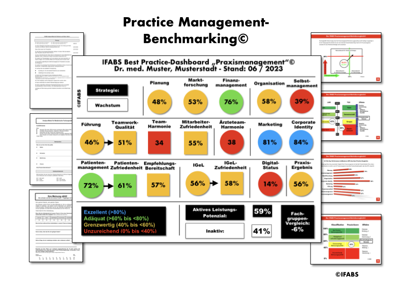 Bevor man eine Strategie entwickelt, muss man wissen, wo man steht. Der erste Schritt in der praktischen Umsetzung einer effizienten Praxisstrategie ist daher die Analyse des Ist-Zustandes. Hier können Tools wie das Praxismanagement-Benchmarking eingesetzt werden, um einen Überblick über die aktuelle Situation der Praxis zu bekommen. Durch den Vergleich mit dem Best-Practice-Standard können Schwachstellen und Verbesserungspotenziale identifiziert werden. Er beschreibt alle Regelungen, Instrumente und Verhaltensweisen, die für eine auch unter wechselnden Anforderungen reibungslos funktionierende Arbeit unerlässlich sind. Eine derartige Analyse deckt alle Bereiche der Praxis ab, von der Patientenversorgung und dem Personalmanagement hin zu Finanzen und Marketing.