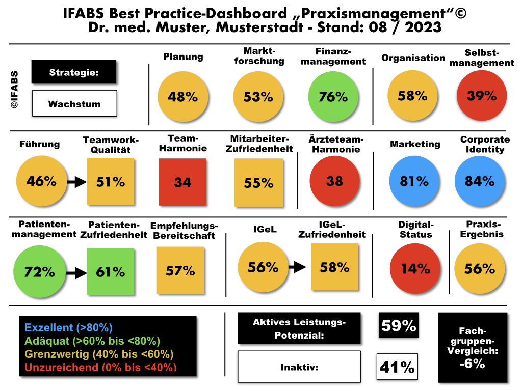Ein Praxismanagement-Benchmarking identifiziert je Praxis im Durchschnitt 40 bisher ungenutzte Verbesserungsvorschläge. Außerdem werden verdeckte Risikofaktoren identifiziert, die das Wohl der Praxis gefährden könnten. In einer sich schnell verändernden gesundheitlichen Landschaft ist ein derartiges datengesteuertes und präzises Praxismanagement unerlässlich für den langfristigen Erfolg. Zu berücksichtigen ist dabei auch, dass in deutschen Arztpraxen im Mittel etwa die Hälfte des Best Practice-Standards nicht eingesetzt wird. Hieraus resultiert u. a. auch die Beeinträchtigungen, die Ärzte, Medizinische Fachangestellte und Patienten täglich leidvoll erleben sowie die geringe Belastbarkeit der Praxisleistung bei Veränderungen.