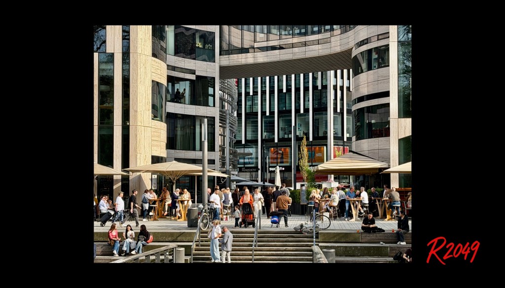 This visual from the R2049 archive analysis examines how public urban spaces create the illusion of social interaction while structurally operating as coordination systems. It highlights how architecture, flow, and spatial design enable parallel presence without requiring actual connection, agreement, or shared intent.