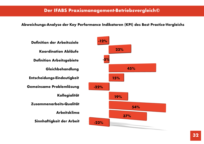 Dienen Betriebsvergleiche normalerweise einer Einordnung der wirtschaftlichen Situation von Arztpraxen, bietet der IFABS Praxismanagement-Betriebsvergleich© Haus- und Fachärzten die völlig neue Möglichkeit, Art, Intensität und Effekte ihrer Praxisführung den repräsentativen Gegebenheiten ihrer Fachgruppe sowie dem Best Practice-Standard gegenüberzustellen, Wirkungs-Zusammenhänge zu prüfen und bislang ungenutzte Verbesserungs-Möglichkeiten zu identifizieren.