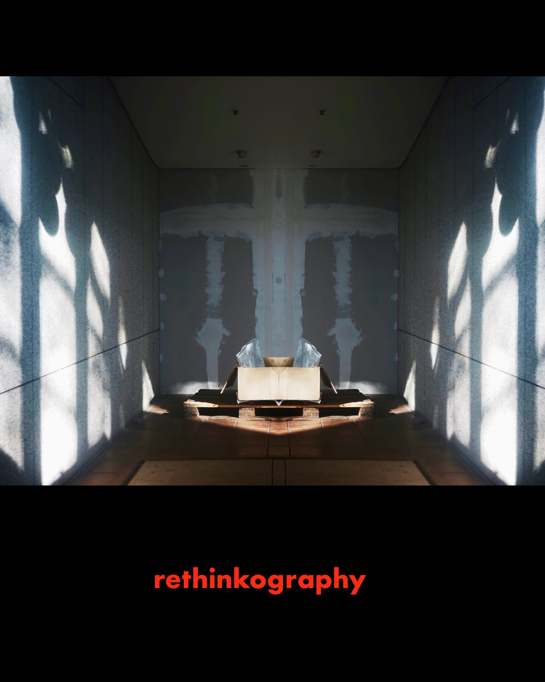 Dieses Bild wirkt wie ein stilles Mahnmal – eine kahle, fast klinische Raumszene, durchzogen von Licht und Schatten, mit einem improvisiert wirkenden „Altar“ aus Paletten und Karton. Im Hintergrund erscheint – wie eingraviert – das schemenhafte Kreuz einer Wandverbindung, das sich zur symbolträchtigen Form der Überwachung und Kontrolle verdichtet. Es erinnert an das, was nicht ausgesprochen, aber ständig präsent ist: die unsichtbare Macht des Micromanagements.