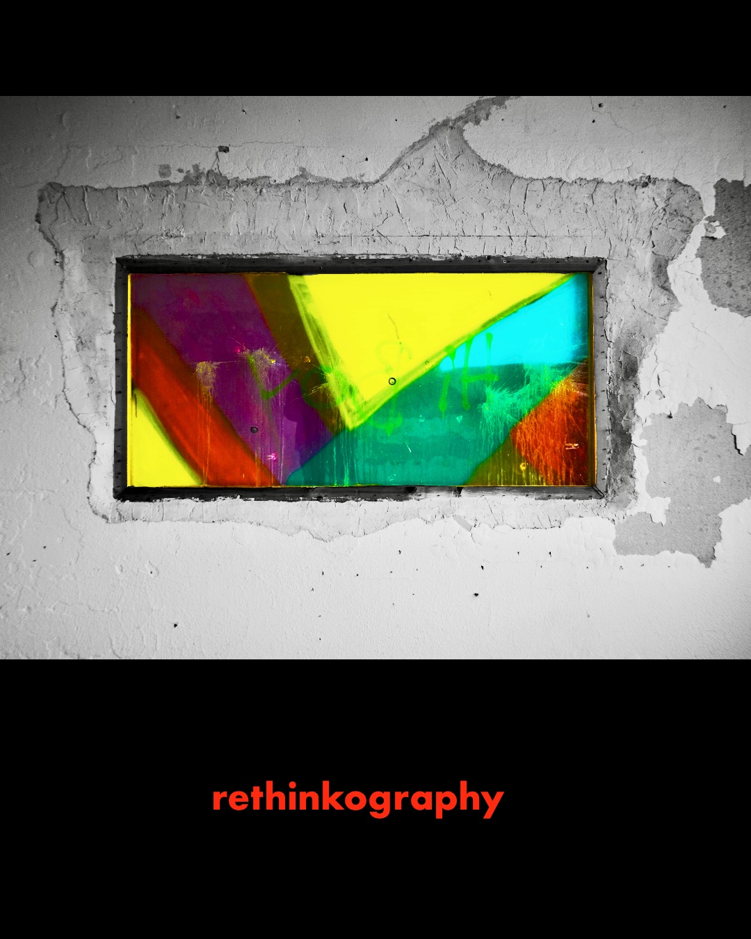 Dieses Bild zeigt ein grellbuntes, geometrisch zersplittertes Fenster inmitten einer grauen, rissigen Wand. Was auf den ersten Blick wie ein Kontrast zwischen Farbe und Verfall wirkt, ist in Wahrheit eine Metapher fĂĽr dein eigenes Denken: