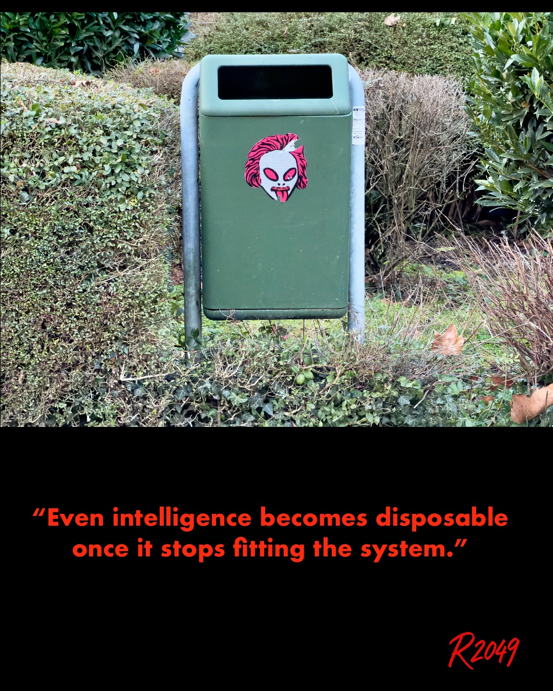 I am observing a discarded hybrid: Einstein’s face, an alien’s eyes, the tongue of provocation, pasted where only waste is expected.