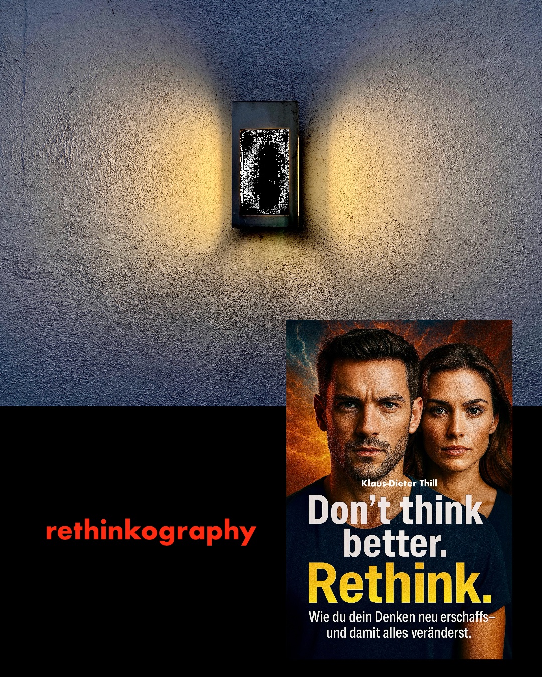 Das Bild zeigt eine schlichte Wandlampe, deren Licht nicht nur den Raum erhellt, sondern in zwei klar abgegrenzte Richtungen strahlt. In der Mitte – dort, wo die Quelle sitzt – wirkt es fast dunkel, roh, unbearbeitet. Diese Szene ist eine Metapher für den Kern des Buches „Don’t think better. Rethink.“: