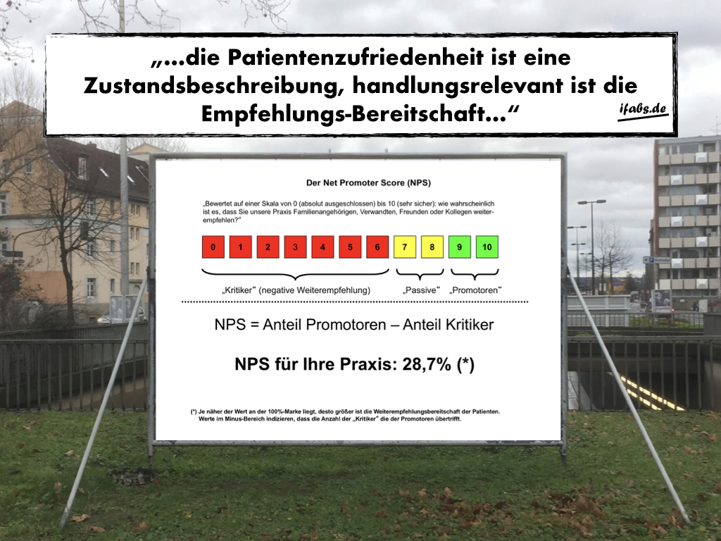 Parallel zur Bestimmung des Key Performance-Indikators „Patient Care Quality Score“ (PCQS) für die Leistungsmerkmale einer Arztpraxis ist auch die Feststellung der generellen Bereitschaft zur Weiterempfehlung der Praxis notwendig, um das Aktivierungs-Potenzial der erreichten Patientenorientierung erfassen zu können.