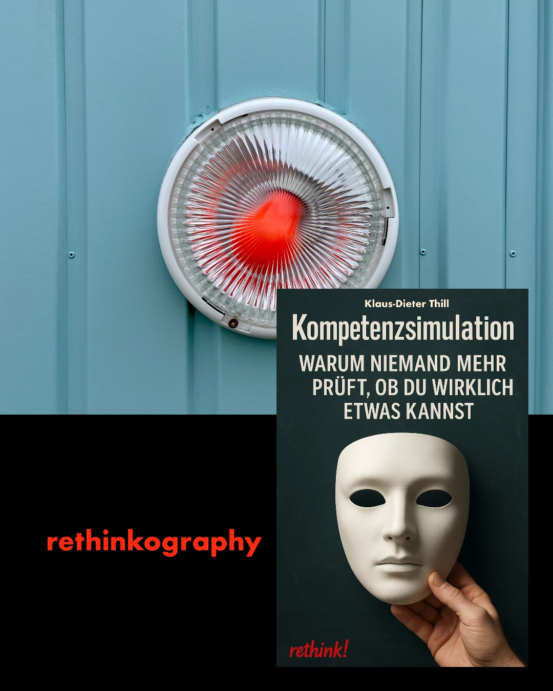 Die Außenleuchte, montiert auf kaltem Metall, steht wie kaum ein anderes Bild für das zentrale Thema des Buches „Kompetenzsimulation“. Sie strahlt – aber nicht, weil sie Licht spendet, sondern weil sie so konstruiert ist, zu wirken, als würde sie es tun. Der grelle rote Kern suggeriert Aktivität, Präsenz, Alarm. Doch hinter der Hülle: keine Bewegung, keine Energie, keine tatsächliche Funktion. Nur die perfekte Illusion von Bedeutung.