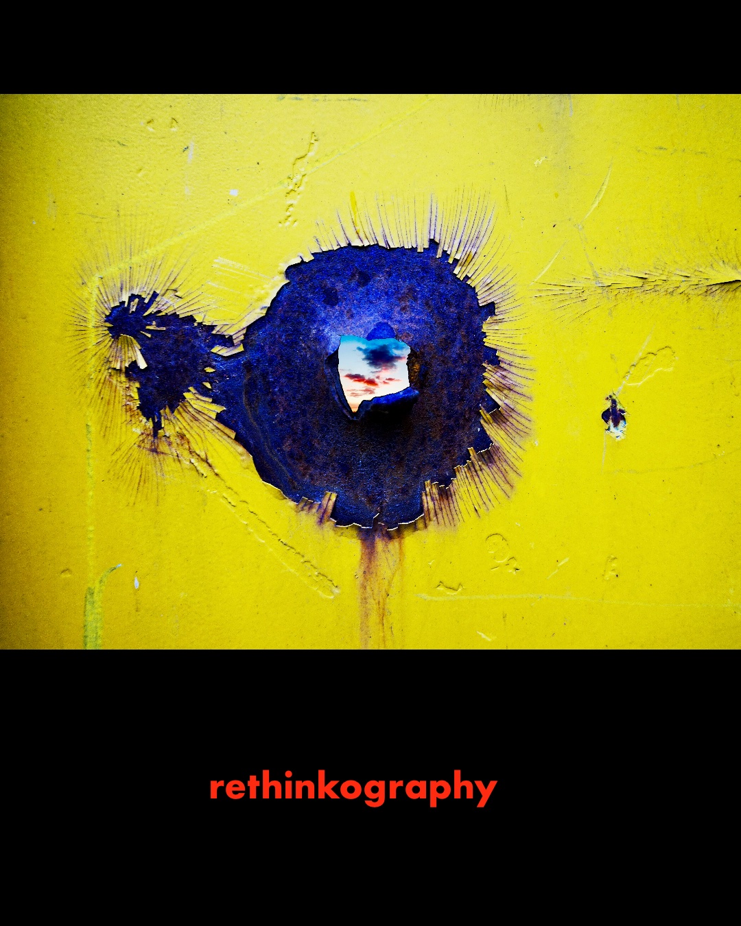 Was auf den ersten Blick aussieht wie ein rostiges Einschussloch auf gelbem Metall, entpuppt sich bei genauerem Hinsehen als visuelle Metapher für mentale Unabhängigkeit. Der dunkle Krater steht für das, was unsere Gedanken angreift: gesellschaftliche Erwartung, Urteil, Angst. Doch inmitten dieser Zerstörung öffnet sich ein Durchblick – klar, leuchtend, überraschend frei. Was sichtbar wird, ist nicht das Chaos, sondern der Horizont. Der Sonnenuntergang dahinter symbolisiert das, was uns entgeht, solange unser Denken von außen gesteuert ist. Nur wer die harte Schicht durchbricht, entdeckt die eigentliche Wirklichkeit – und den eigenen Blick darauf.