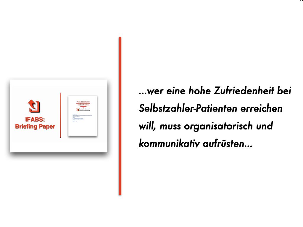 Haus- und Fachärzte nutzen das Angebot von Selbstzahler-Leistungen, um ihre unternehmerische Freiheit zu sichern bzw. auszubauen sowie die Attraktivität ihres Praxis-Angebotes zu erhöhen. Doch in der praktischen Umsetzung sind nur zwei von zehn Praxisinhabern, die enthusiastisch mit der Self-payer-Arbeit beginnen, nach der Einführungsphase auch wirtschaftlich mit dieser Angebotsform erfolgreich.