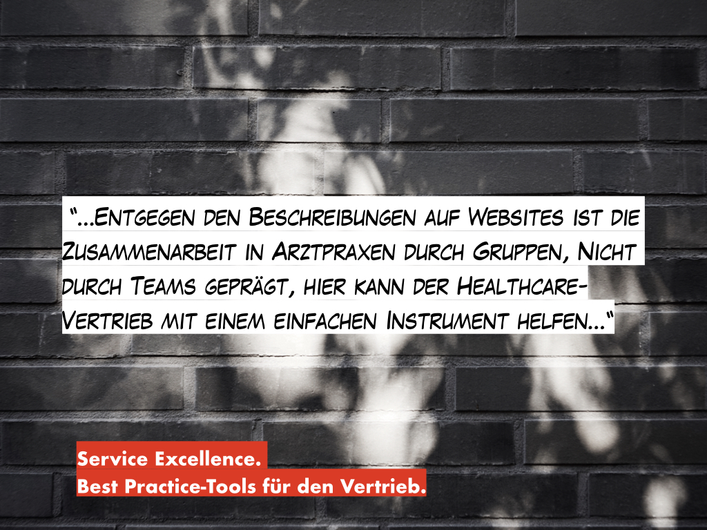Eine zunehmende Anzahl Vertriebsmitarbeiter erkennt die Möglichkeiten, ihre Arbeit durch eine Unterstützung des Praxismanagements der von ihnen besuchten Haus- und Fachärzte zu intensivieren. Der dabei vermittelte konkrete Nutzen für Praxisalltag wertet die Gespräche auf und profiliert gleichzeitig die eigene Kompetenz. Ein Support-Ansatzpunkt besteht beispielsweise darin, Praxisinhabern ein konkretes Best Practice-Instrument, eine Mitarbeiterbefragung, anzubieten, um ihre Teamwork-Qualität zu optimieren. Continue reading “Service Excellence durch Best Practice-Support: Was Healthcare-Vertriebsmitarbeiter Haus- und Fachärzten zum Thema „Teamwork“ raten sollten”