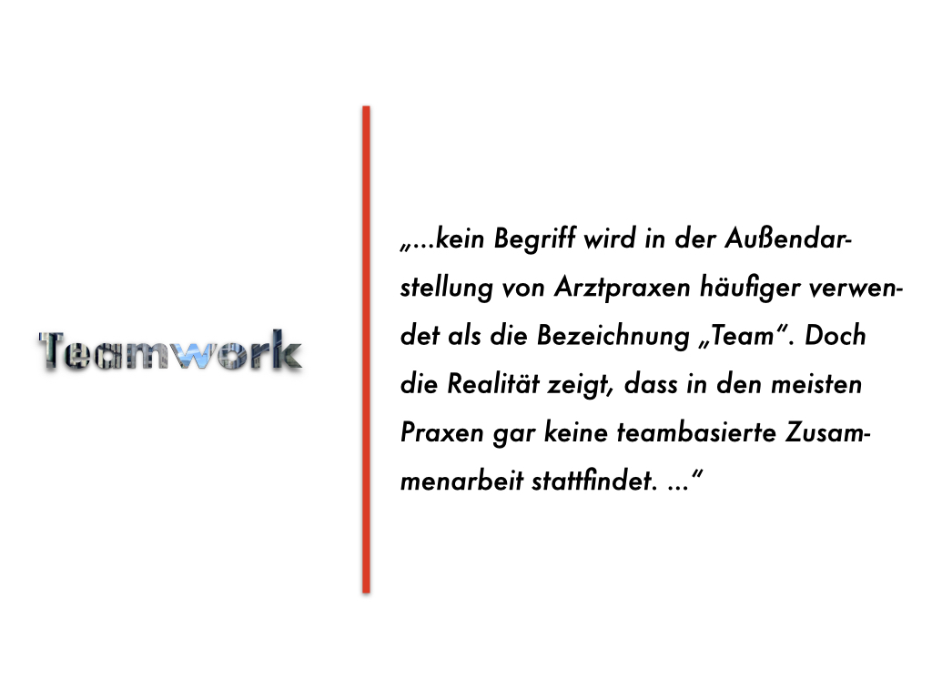 Eine durch ausgeprägte Effizienz und Produktivität charakterisierte Praxisarbeit beruht stets auf dem Prinzip der Teamarbeit. Doch in den meisten Arztpraxen arbeiten i. d. R. lediglich Gruppen statt Teams, die mit ihren Arbeitsresultaten nicht annähernd die Leistungsqualität von Teamstrukturen erreichen.
