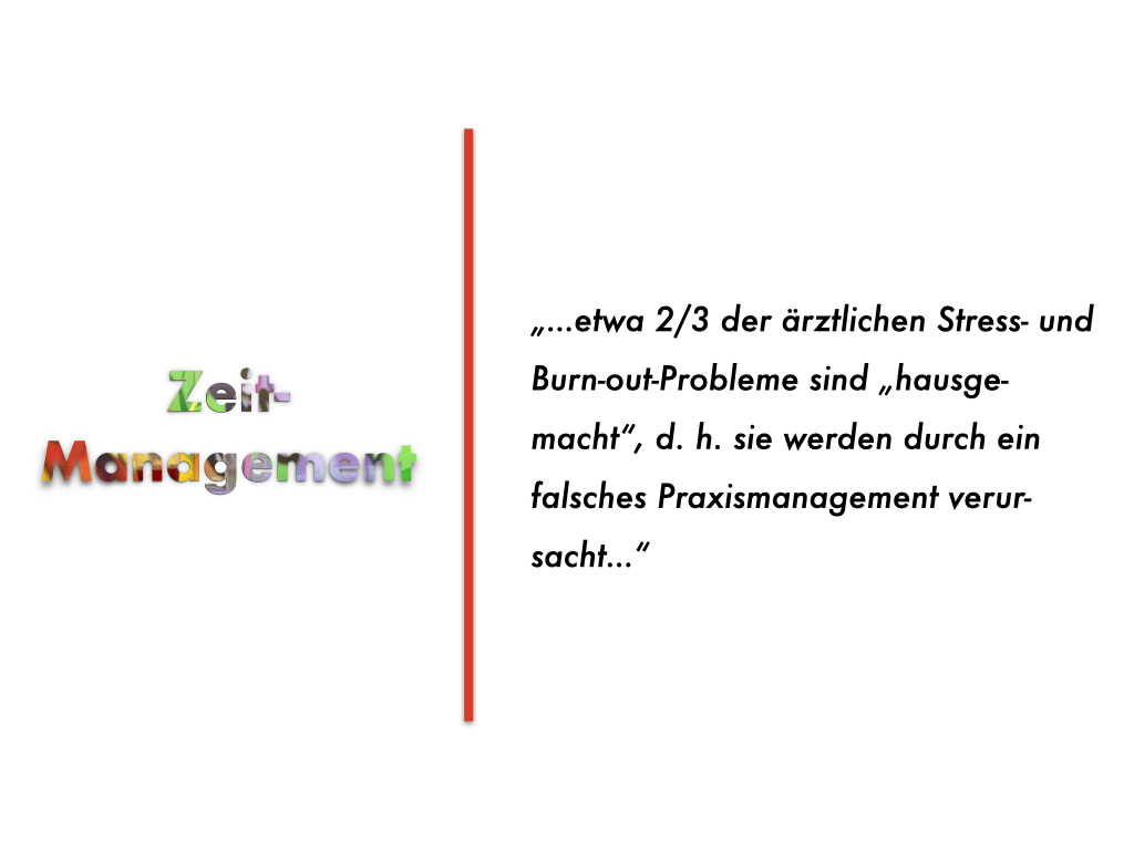 Immer mehr Hausärzte klagen über chronische Arbeitsüberlastung, Zeitdruck und ständigen Zeitmangel. Wird diese Situation zu einem Dauerzustand, kommt es zu Stress, Frustration und Demotivation. Das wirkt sich auch auf das Personal, die Patienten und das Privatleben aus. Arbeitsanalysen zeigen jedoch, dass die meisten Ärzte, die diese Symptome beklagen, prinzipiell über genügend Zeit verfügen, allen an sie herangetragenen Ansprüchen gerecht zu werden, allerdings müssen sie ihre Zeit anders – und damit besser – einteilen und nutzen.